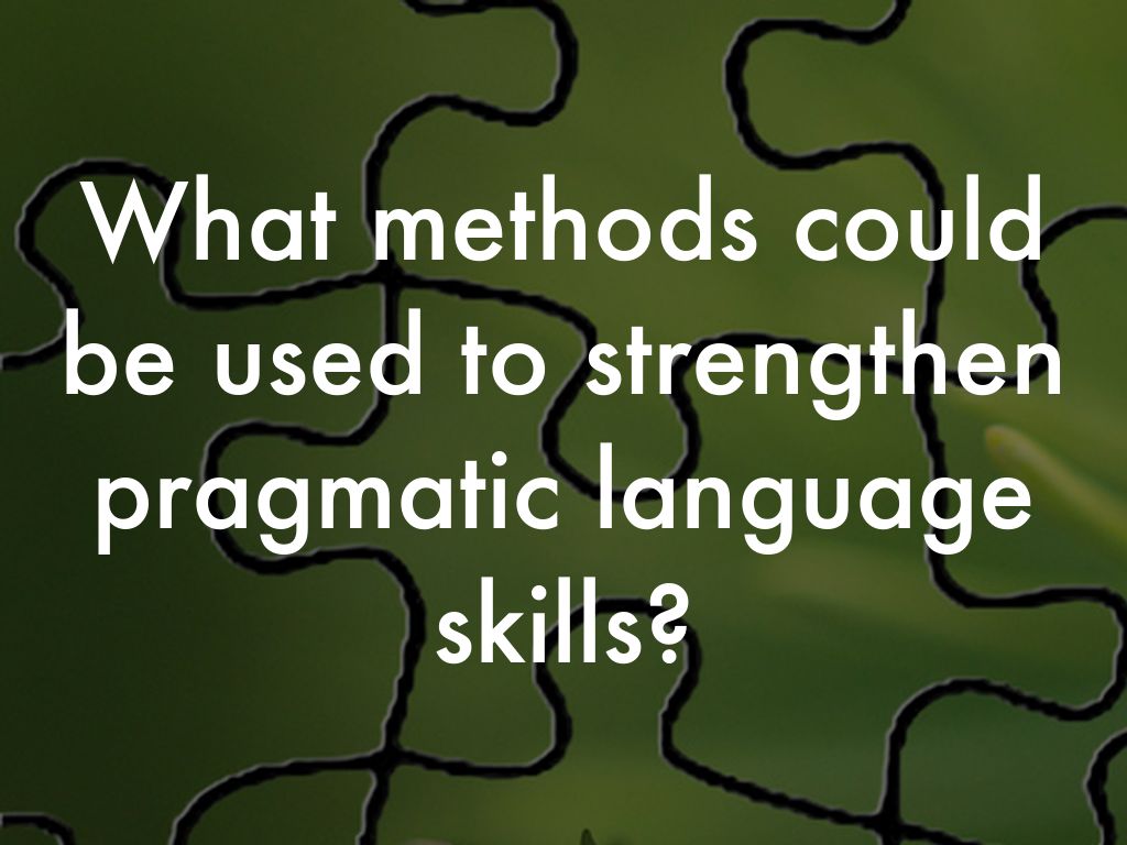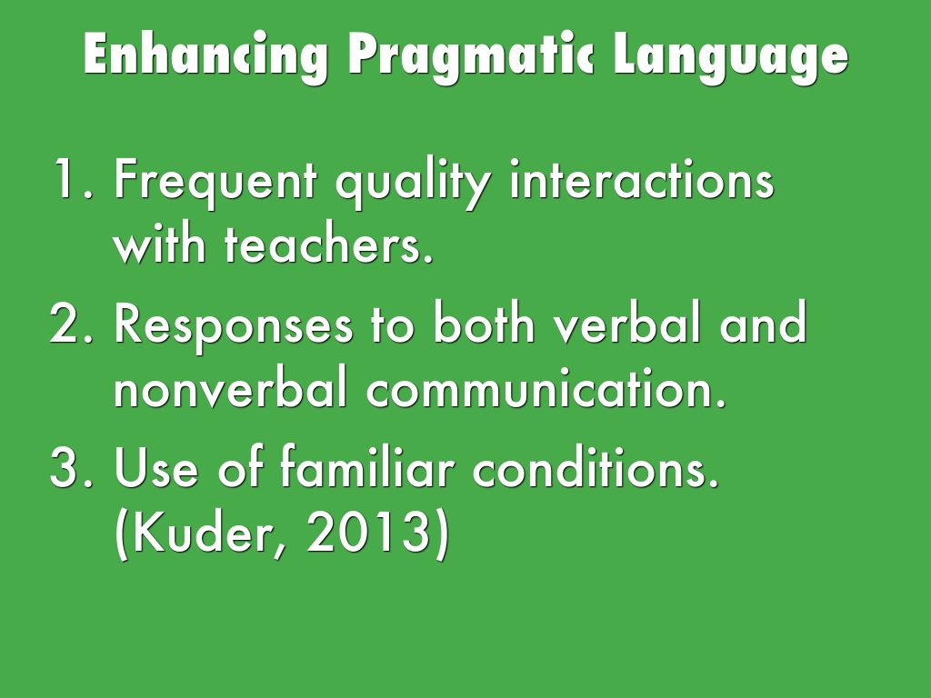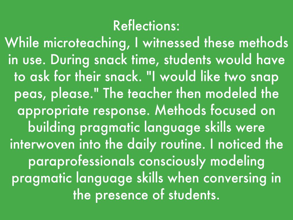 While microteaching, I witnessed these methods in use. During snack time, students would have to ask for their snack. "I would like two snap peas, please." The teacher then modeled the appropriate response. Methods focused on building pragmatic language skills were interwoven into the daily routine. I noticed the paraprofessionals consciously modeling pragmatic language skills when conversing in the presence of students.