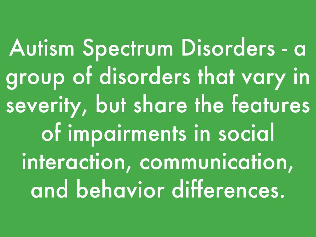 Autism Spectrum Disorders - a group of disorders that vary in severity, but share the features of impairments in social interaction, communication, and behavior differences.