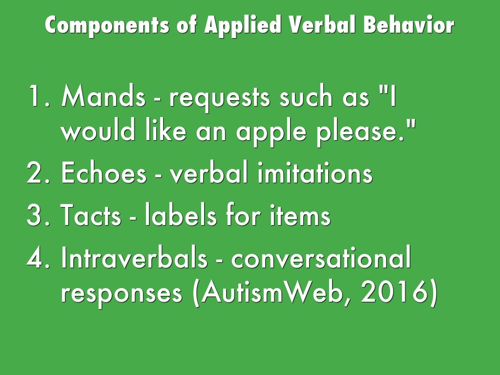• Intraverbals - conversational responses (AutismWeb, 2016)