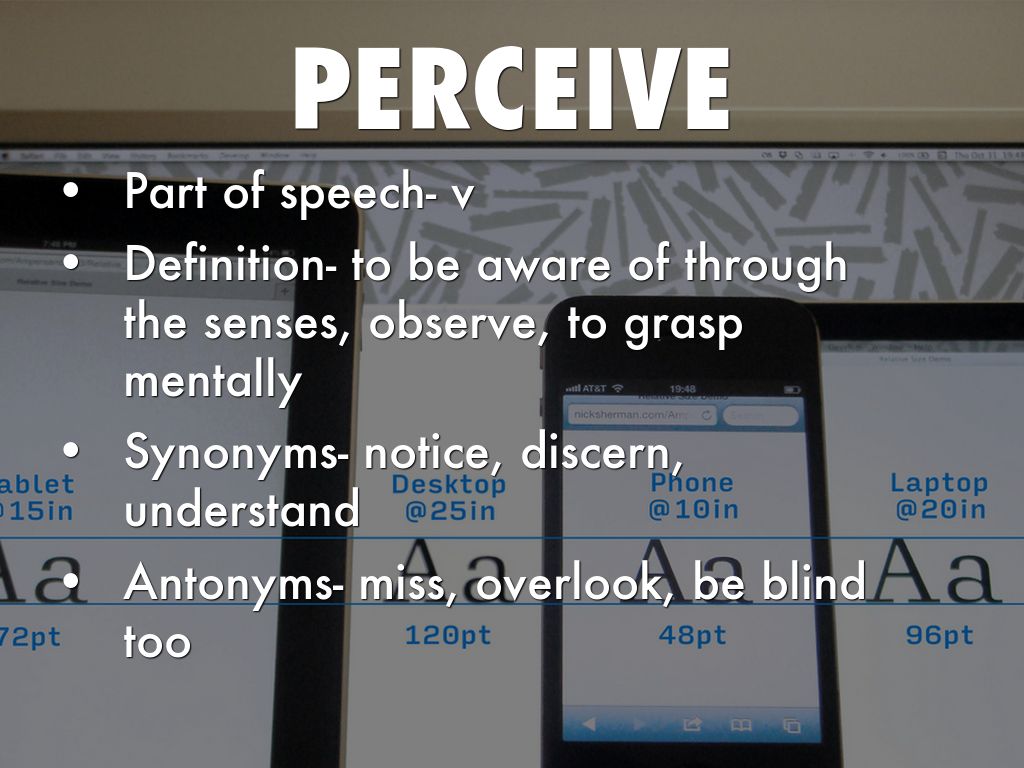 Definition- to be aware of through the senses, observe, to grasp mentally