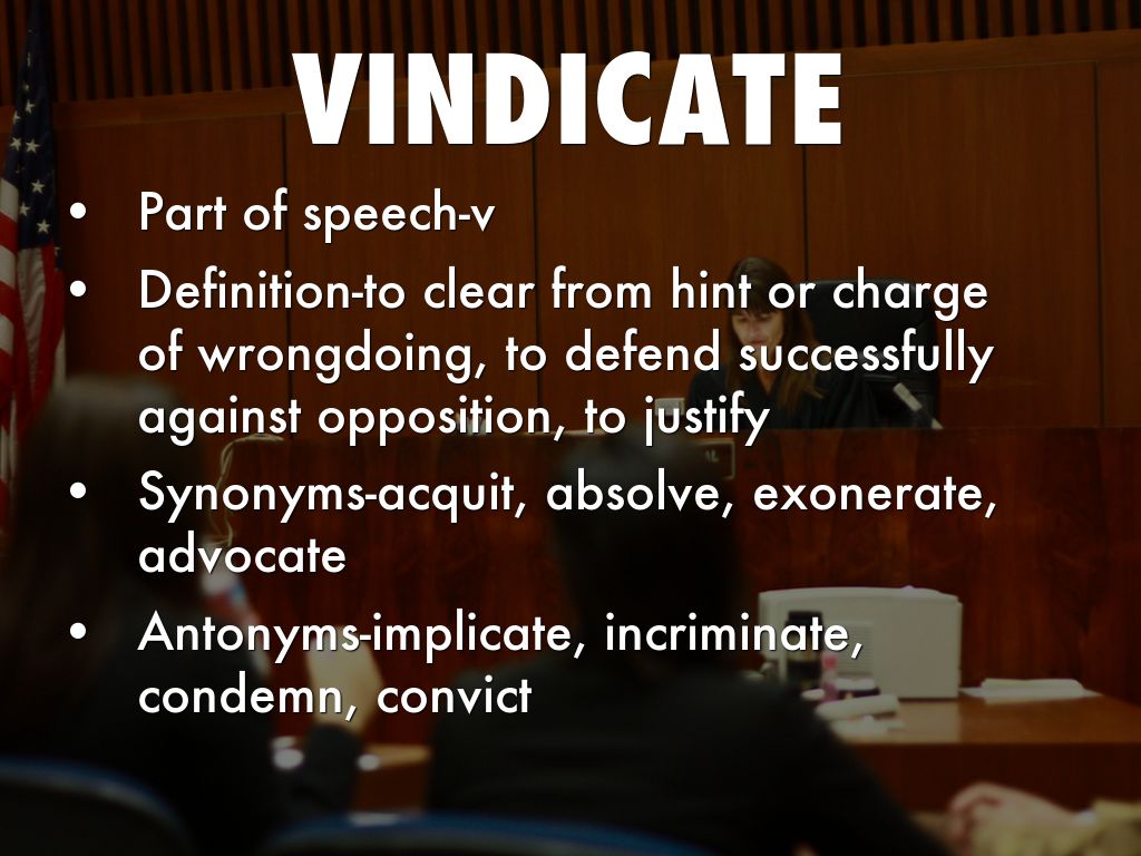 Definition-to clear from hint or charge of wrongdoing, to defend successfully against opposition, to justify