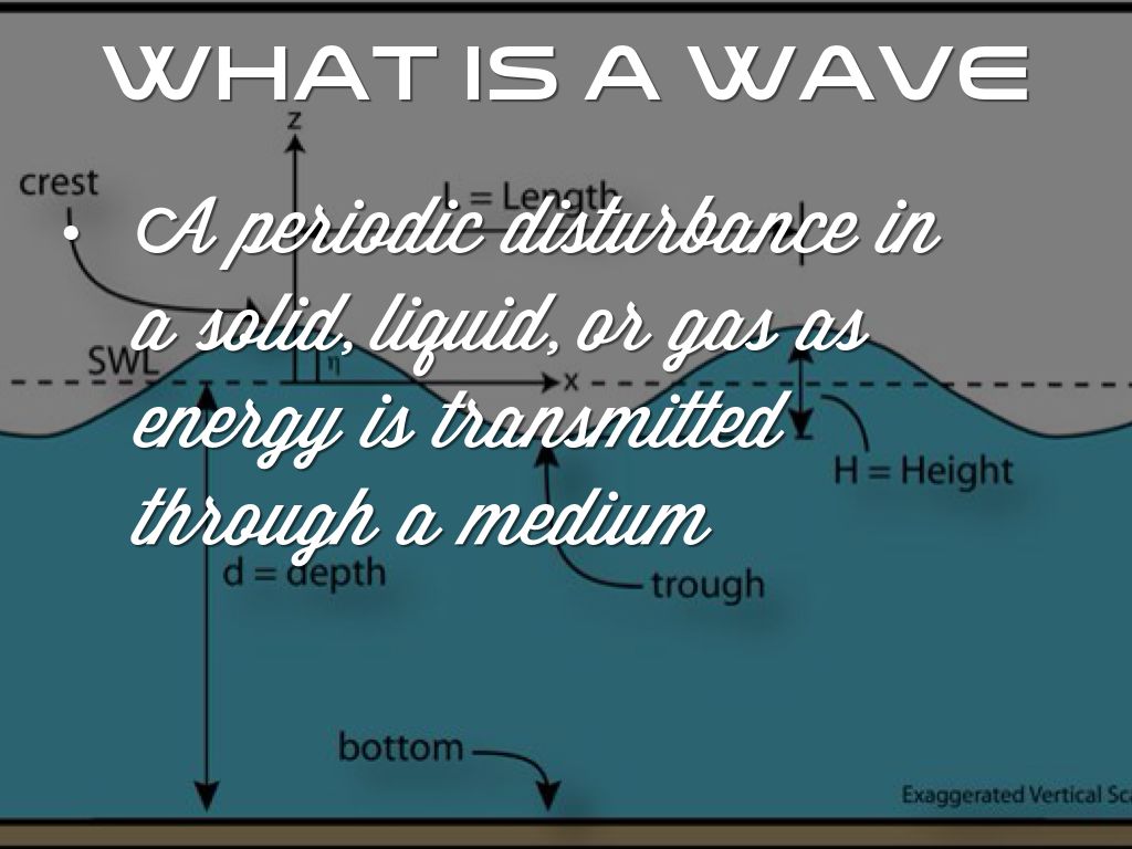 A periodic disturbance in a solid, liquid, or gas as energy is transmitted through a medium