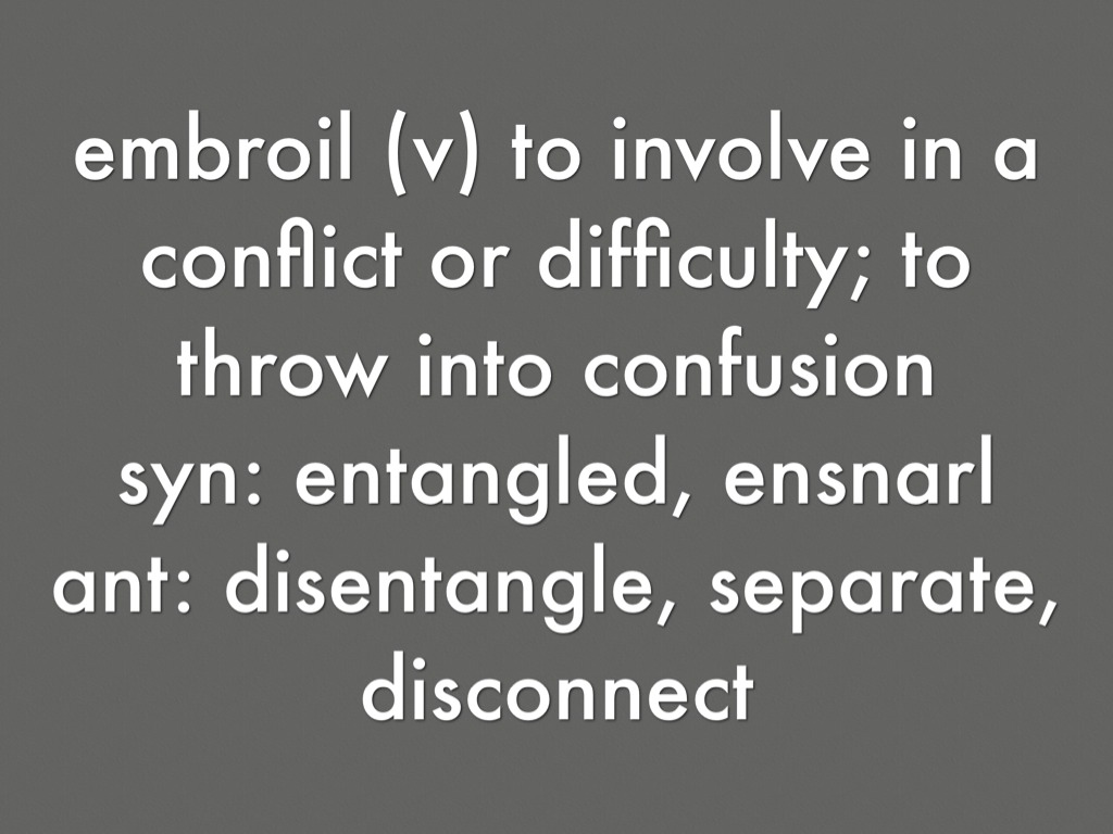 embroil (v) to involve in a conflict or difficulty; to throw into confusion