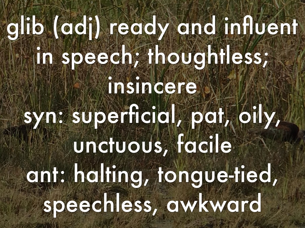 glib (adj) ready and influent in speech; thoughtless; insincere