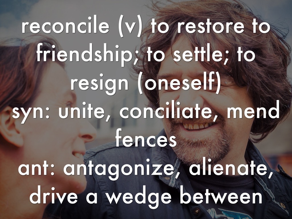 reconcile (v) to restore to friendship; to settle; to resign (oneself)