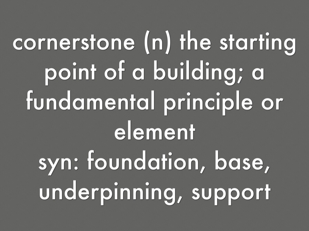 cornerstone (n) the starting point of a building; a fundamental principle or element
