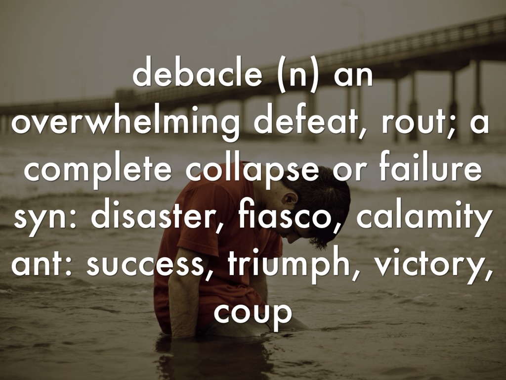 debacle (n) an overwhelming defeat, rout; a complete collapse or failure