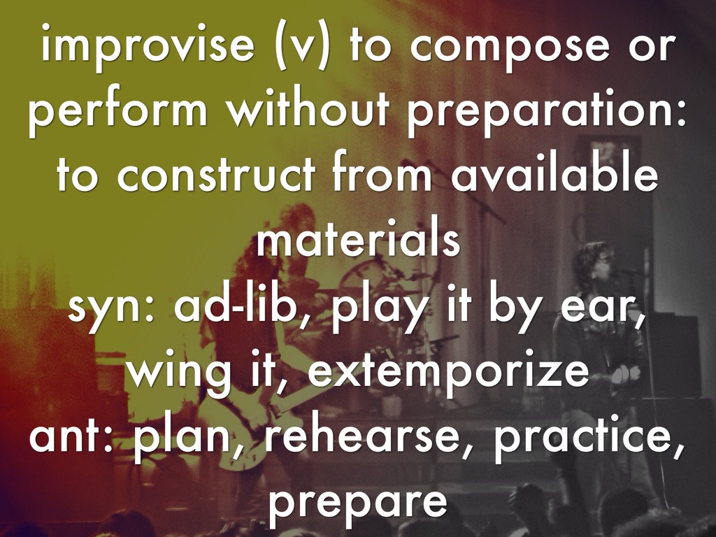 improvise (v) to compose or perform without preparation: to construct from available materials