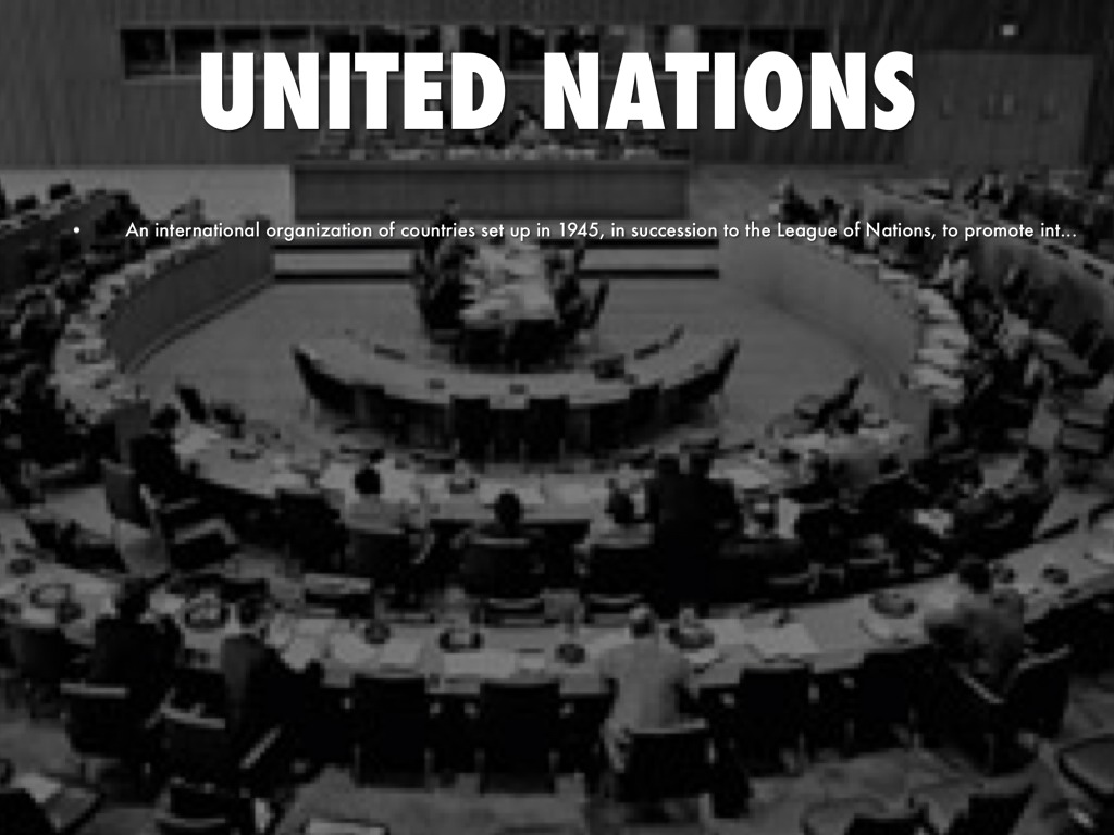 An international organization of countries set up in 1945, in succession to the League of Nations, to promote international peace, security, and cooperation.