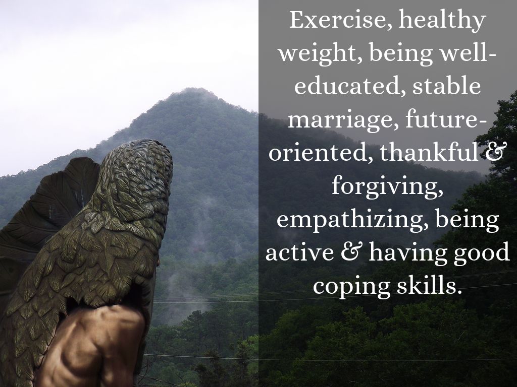 Exercise, healthy weight, being well-educated, stable marriage, future-oriented, thankful & forgiving, empathizing, being active & having good coping skills.
