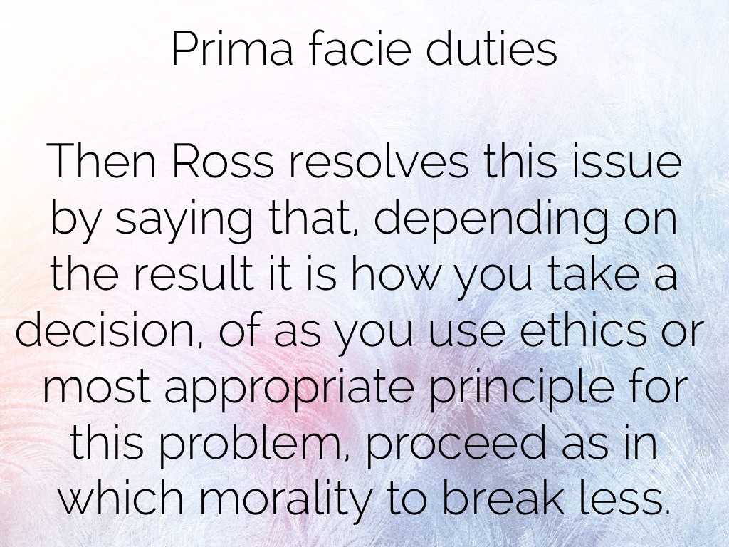Then Ross resolves this issue by saying that, depending on the result it is how you take a decision, of as you use ethics or most appropriate principle for this problem, proceed as in which morality to break less.