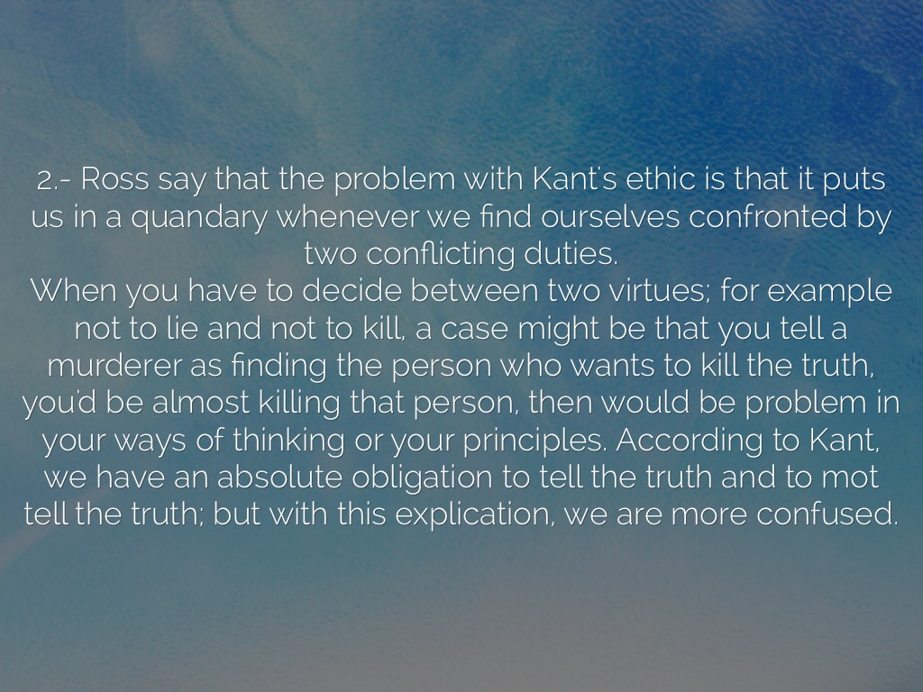 2.- Ross say that the problem with Kant's ethic is that it puts us in a quandary whenever we find ourselves confronted by two conflicting duties.
