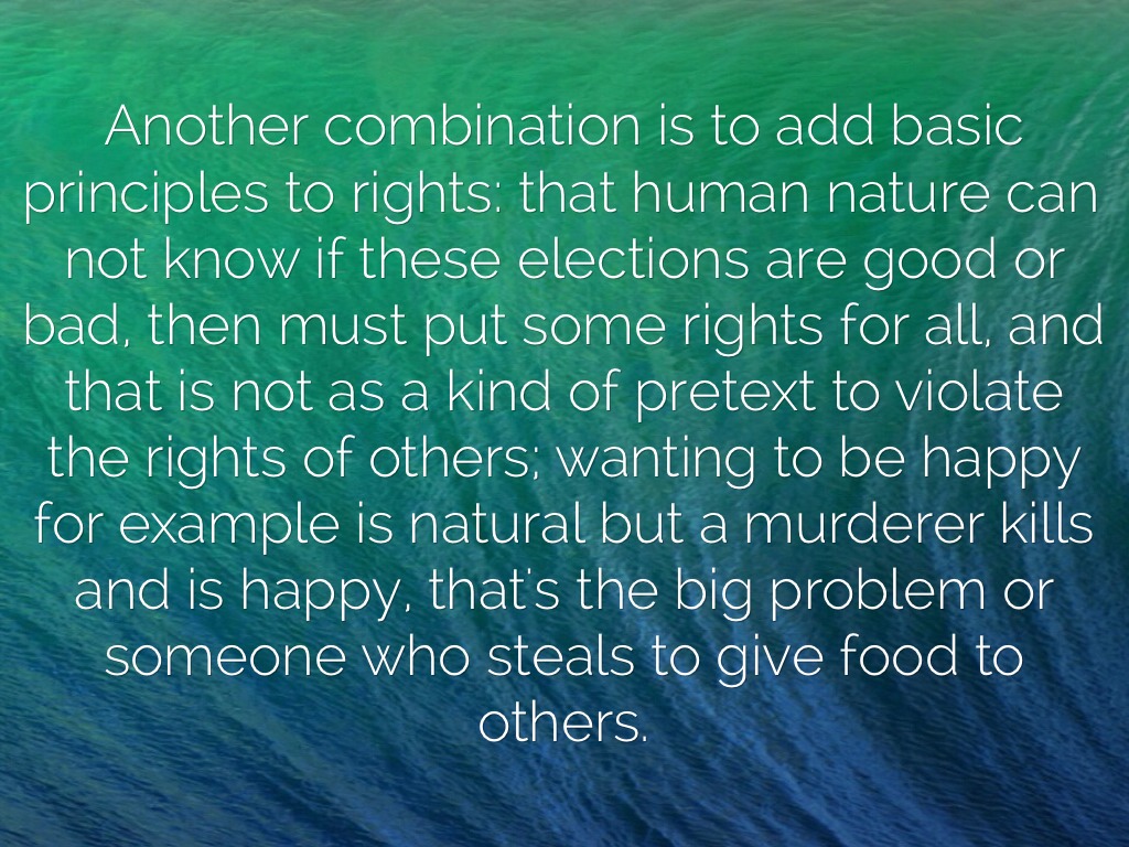 Another combination is to add basic principles to rights: that human nature can not know if these elections are good or bad, then must put some rights for all, and that is not as a kind of pretext to violate the rights of others; wanting to be happy for example is natural but a murderer kills and is happy, that's the big problem or someone who steals to give food to others.