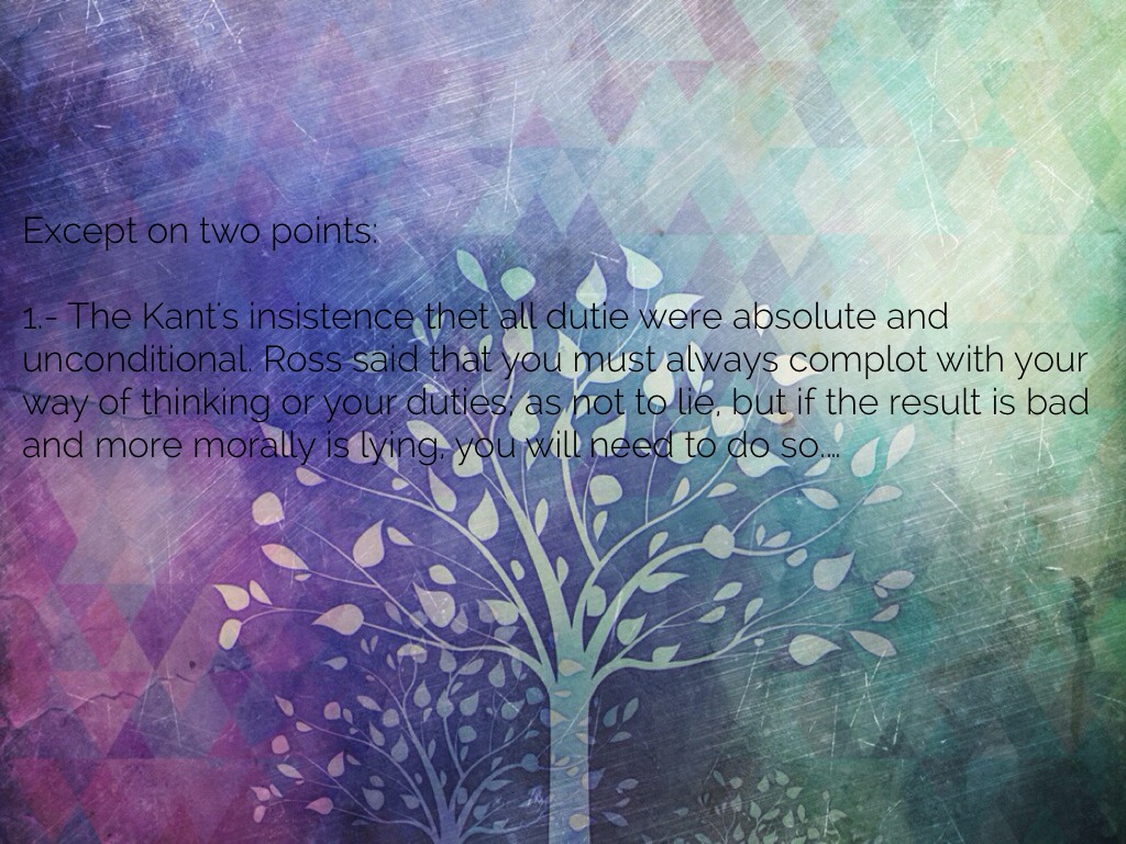 1.- The Kant's insistence thet all dutie were absolute and unconditional. Ross said that you must always complot with your way of thinking or your duties; as not to lie, but if the result is bad and more morally is lying, you will need to do so.