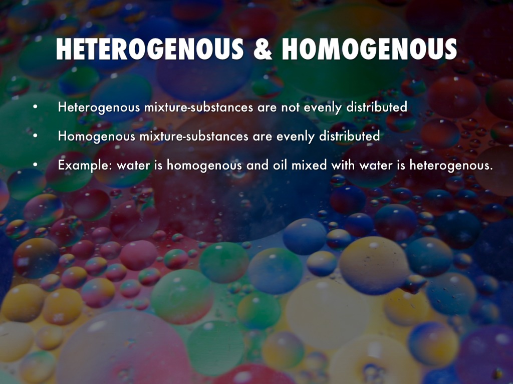 Example: water is homogenous and oil mixed with water is heterogenous.