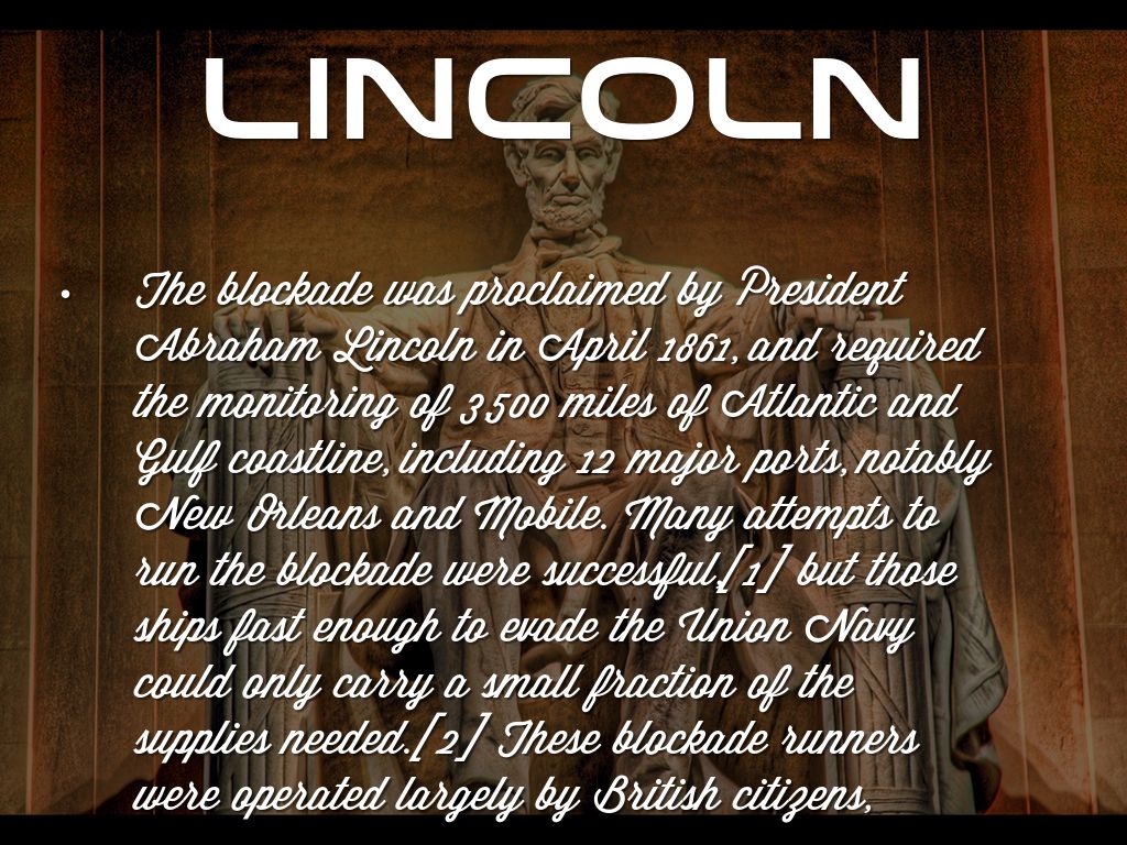 The blockade was proclaimed by President Abraham Lincoln in April 1861, and required the monitoring of 3,500 miles of Atlantic and Gulf coastline, including 12 major ports, notably New Orleans and Mobile. Many attempts to run the blockade were successful,[1] but those ships fast enough to evade the Union Navy could only carry a small fraction of the supplies needed.[2] These blockade runners were operated largely by British citizens, making use of neutral ports such as Havana, Nassau and Bermuda. The Union commissioned 500 ships, which destroyed or captured about 1,500 blockade runners over the course of the war.