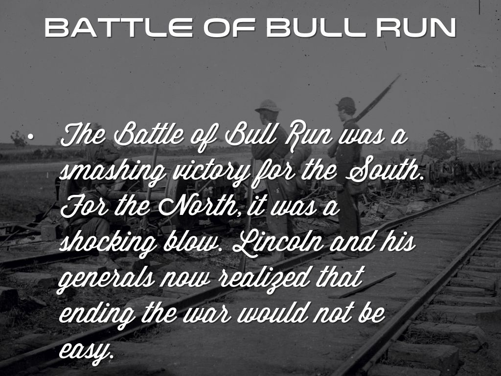 The Battle of Bull Run was a smashing victory for the South. For the North, it was a shocking blow. Lincoln and his generals now realized that ending the war would not be easy.