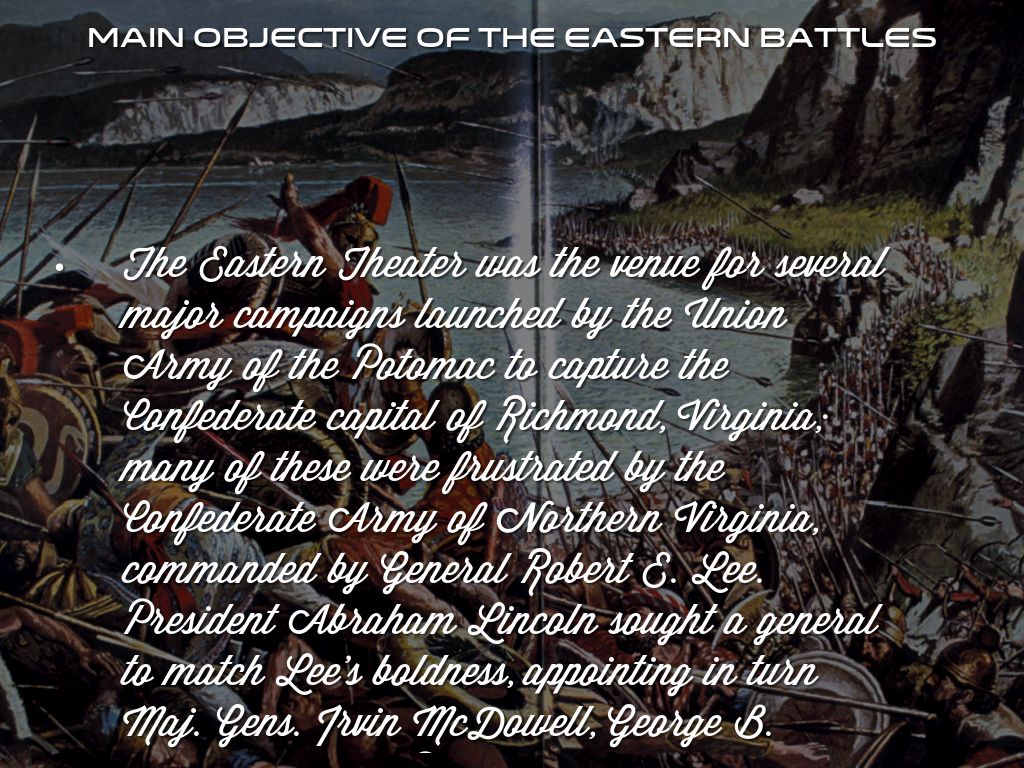 The Eastern Theater was the venue for several major campaigns launched by the Union Army of the Potomac to capture the Confederate capital of Richmond, Virginia; many of these were frustrated by the Confederate Army of Northern Virginia, commanded by General Robert E. Lee. President Abraham Lincoln sought a general to match Lee's boldness, appointing in turn Maj. Gens. Irvin McDowell, George B. McClellan, John Pope, Ambrose Burnside, Joseph Hooker, and George G. Meade to command his principal Eastern armies. It was not until newly appointed general-in-chief Ulysses S. Grant arrived from the Western Theater in 1864 to take personal control of operations in Virginia that Union forces were able to capture Richmond, but only after several bloody battles of the Overland Campaign and a nine-month siege near the cities of Petersburg and Richmond. The surrender of Lee's army at Appomattox Court House in April 1865 brought major operations in the area to a close.