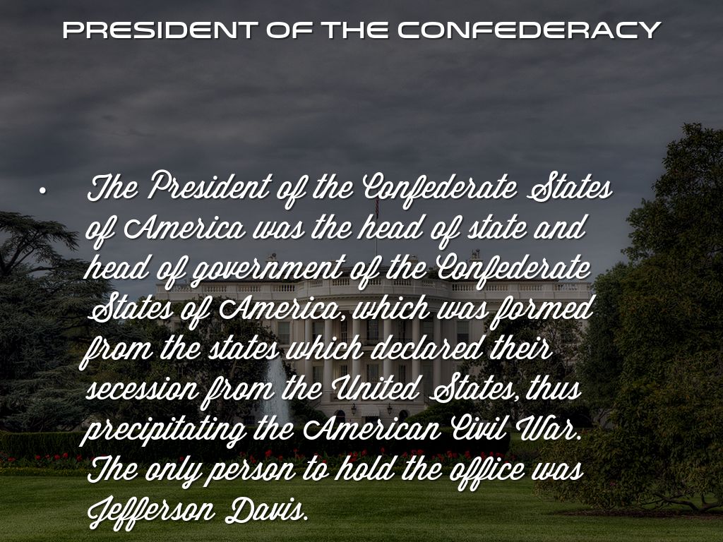 The President of the Confederate States of America was the head of state and head of government of the Confederate States of America, which was formed from the states which declared their secession from the United States, thus precipitating the American Civil War. The only person to hold the office was Jefferson Davis.