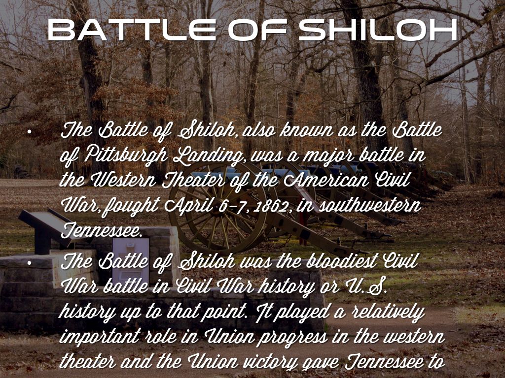 The Battle of Shiloh was the bloodiest Civil War battle in Civil War history or U.S. history up to that point. It played a relatively important role in Union progress in the western theater and the Union victory gave Tennessee to the North.