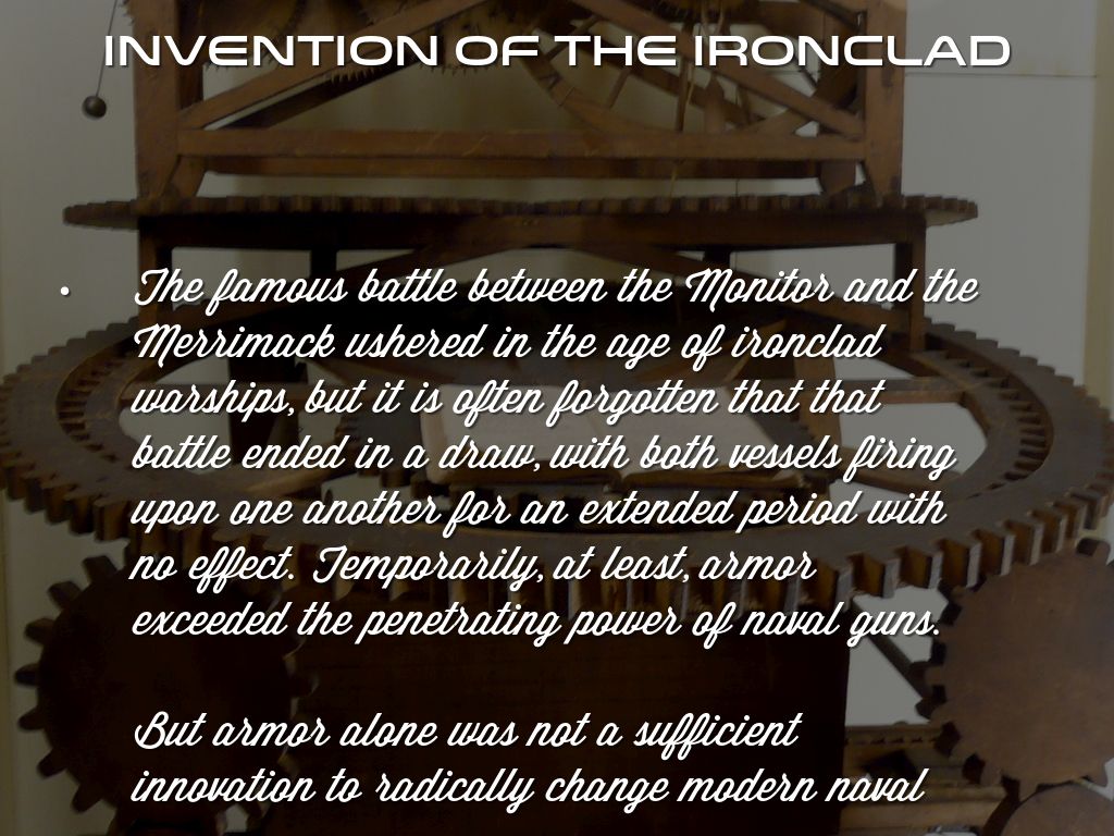 But armor alone was not a sufficient innovation to radically change modern naval warfare. The Monitor and the Merrimack were slow, underpowered and ungainly vessels not well suited to warfare in the open seas. But the introduction of iron, and later steel, in ship construction enabled builders to fabricate much larger ships that could carry larger guns, more fuel, and withstand weather conditions in the open seas.