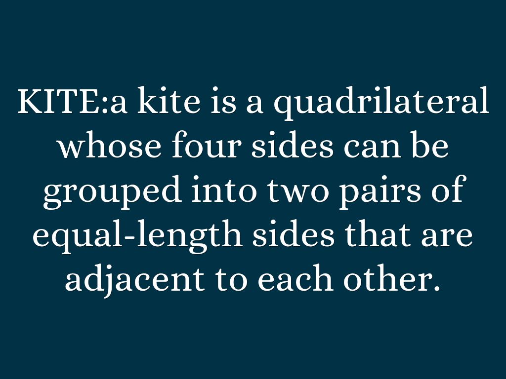 KITE:a kite is a quadrilateral whose four sides can be grouped into two pairs of equal-length sides that are adjacent to each other.