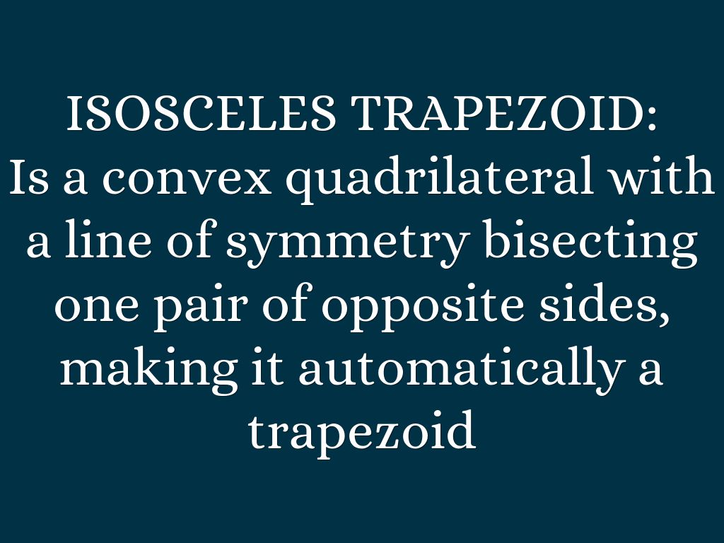 REGULAR TRAPEZOID: is a trapezoid whose non-parallel sides are congruent (of equal length).