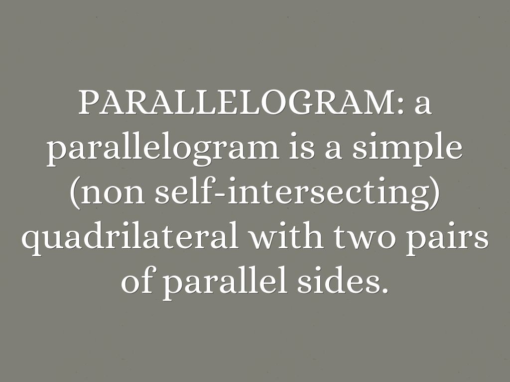 PARALLELOGRAM: a parallelogram is a simple (non self-intersecting) quadrilateral with two pairs of parallel sides.