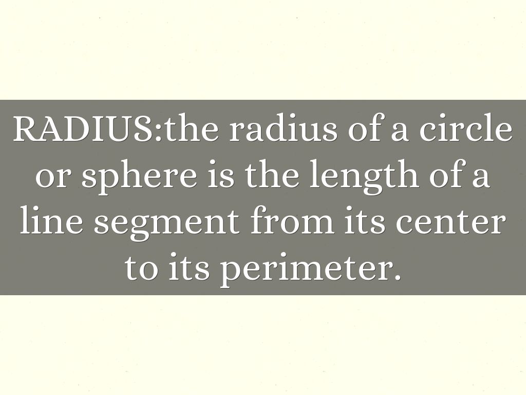 RADIUS:the radius of a circle or sphere is the length of a line segment from its center to its perimeter.