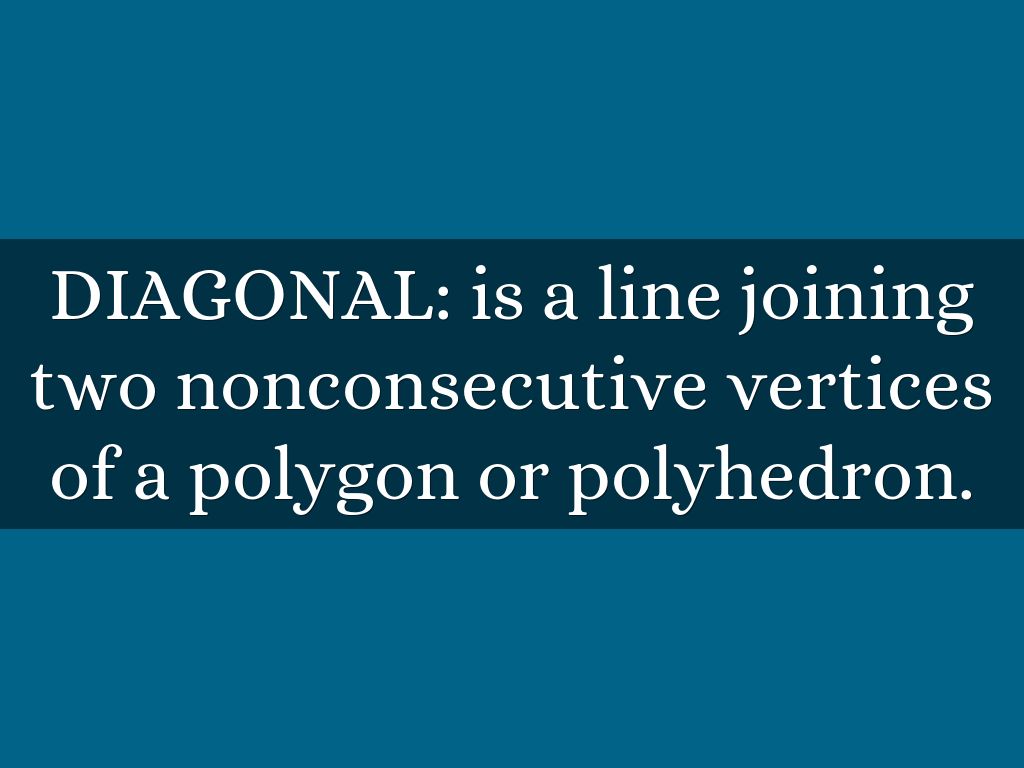DIAGONAL: is a line joining two nonconsecutive vertices of a polygon or polyhedron.