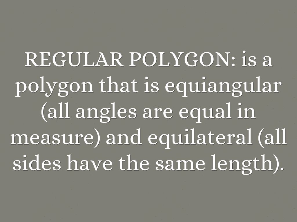 REGULAR POLYGON: is a polygon that is equiangular (all angles are equal in measure) and equilateral (all sides have the same length).