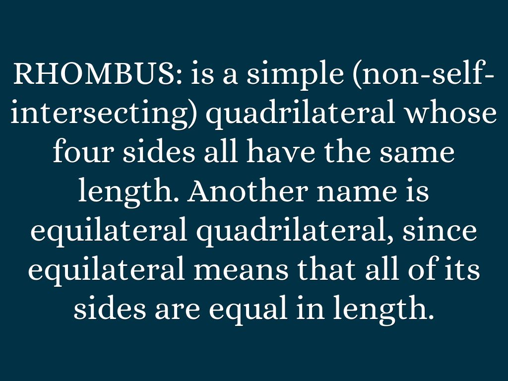 RHOMBUS: is a simple (non-self-intersecting) quadrilateral whose four sides all have the same length. Another name is equilateral quadrilateral, since equilateral means that all of its sides are equal in length.