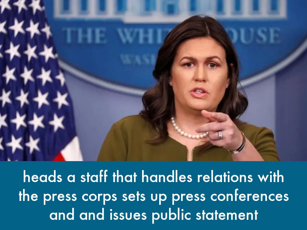 heads a staff that handles relations with the press corps sets up press conferences and and issues public statement