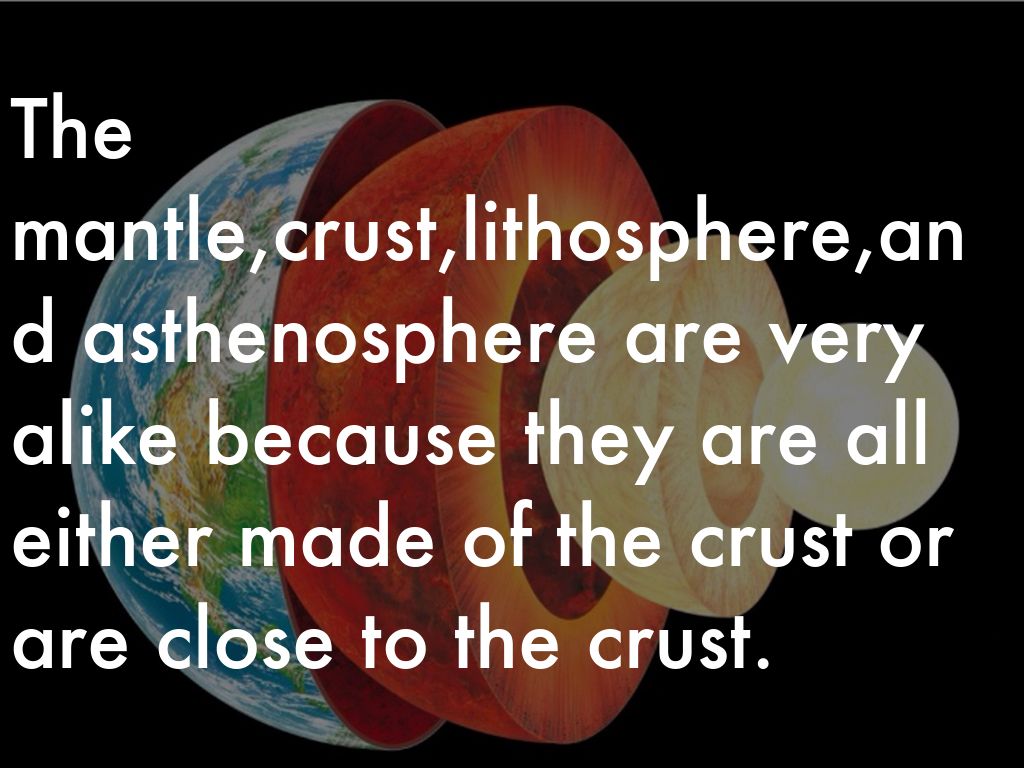 The mantle,crust,lithosphere,and asthenosphere are very alike because they are all either made of the crust or are close to the crust.