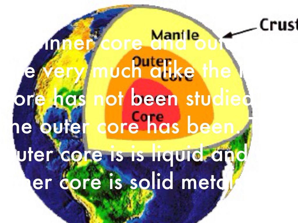 The inner core and outer core are very much alike the inner core has not been studied but the outer core has been. The outer core is is liquid and the inner core is solid metals.
