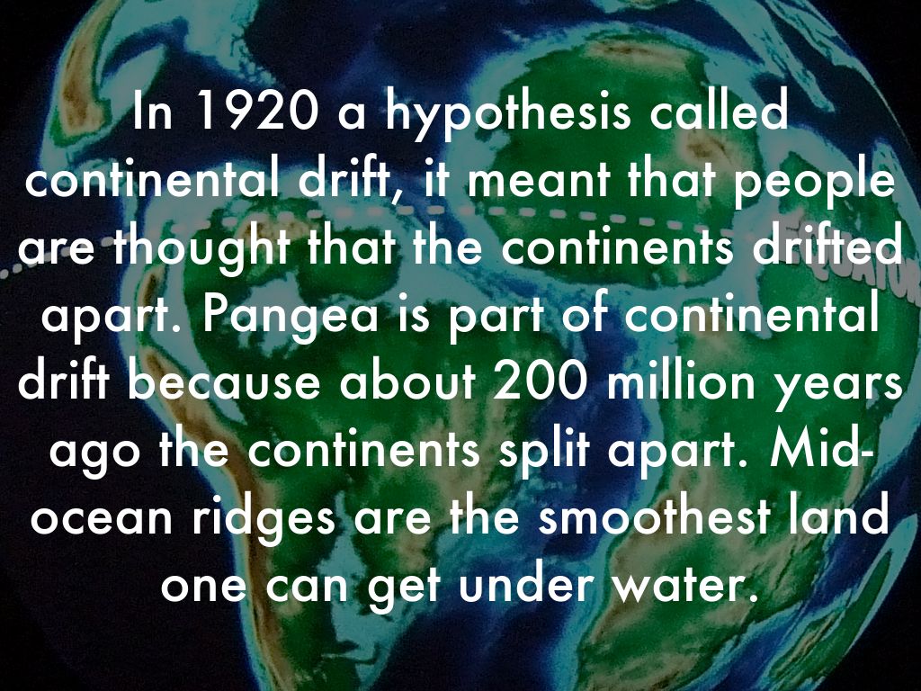 In 1920 a hypothesis called continental drift, it meant that people are thought that the continents drifted apart. Pangea is part of continental drift because about 200 million years ago the continents split apart. Mid-ocean ridges are the smoothest land one can get under water.