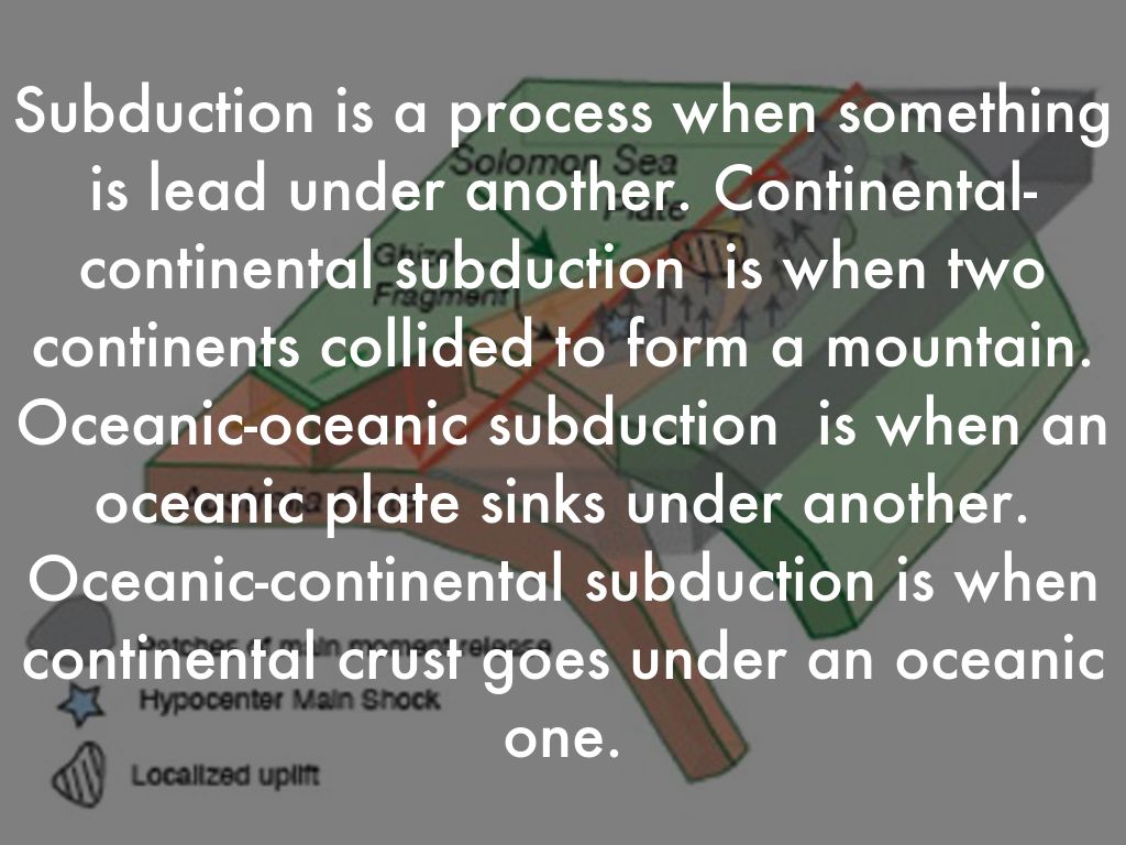 Subduction is a process when something is lead under another. Continental-continental subduction is when two continents collided to form a mountain. Oceanic-oceanic subduction is when an oceanic plate sinks under another. Oceanic-continental subduction is when continental crust goes under an oceanic one.