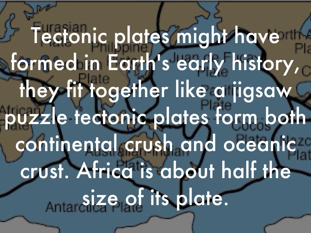 Tectonic plates might have formed in Earth's early history, they fit together like a jigsaw puzzle tectonic plates form both continental crush and oceanic crust. Africa is about half the size of its plate.