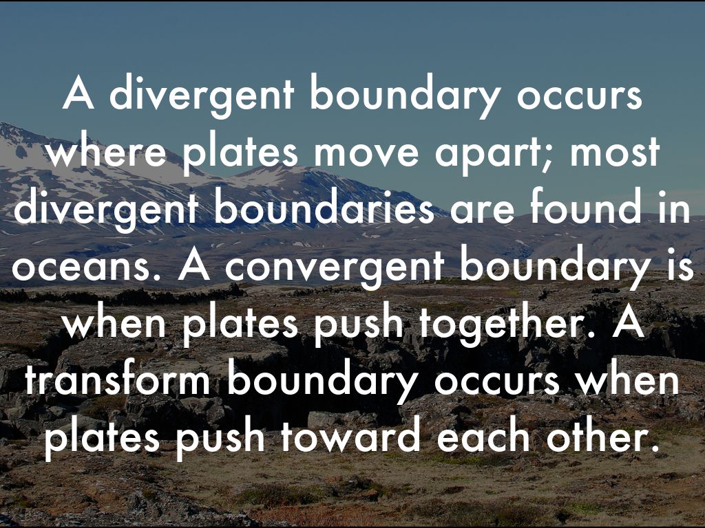 A divergent boundary occurs where plates move apart; most divergent boundaries are found in oceans. A convergent boundary is when plates push together. A transform boundary occurs when plates push toward each other.