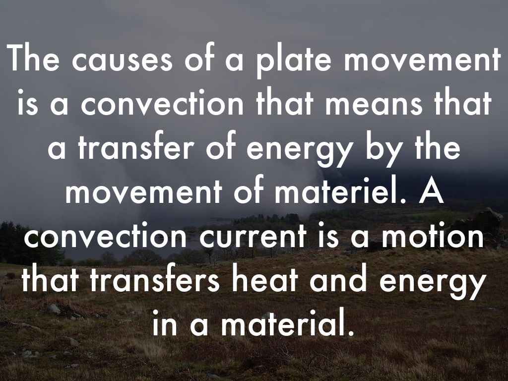 The causes of a plate movement is a convection that means that a transfer of energy by the movement of materiel. A convection current is a motion that transfers heat and energy in a material.