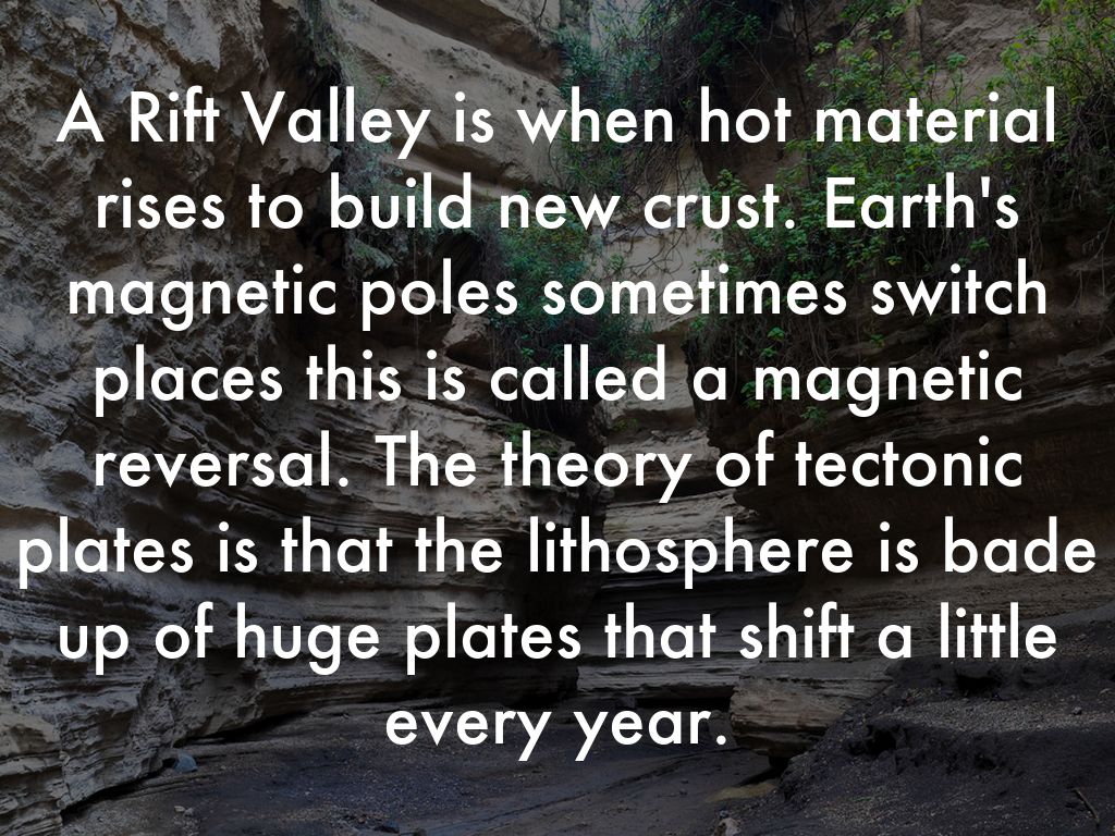 A Rift Valley is when hot material rises to build new crust. Earth's magnetic poles sometimes switch places this is called a magnetic reversal. The theory of tectonic plates is that the lithosphere is bade up of huge plates that shift a little every year.