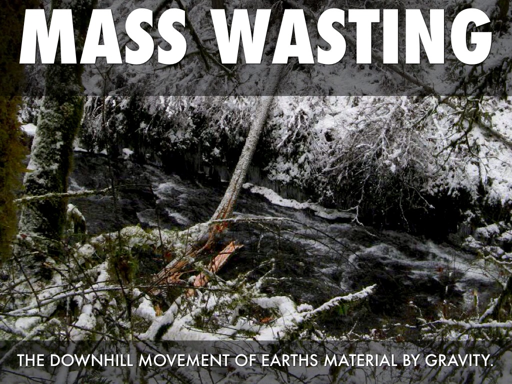 THE DOWNHILL MOVEMENT OF EARTHS MATERIAL BY GRAVITY.