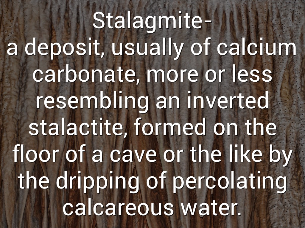 Stalagmite- a deposit, usually of calcium carbonate, more or less resembling an inverted stalactite, formed on the floor of a cave or the like by the dripping of percolating calcareous water.