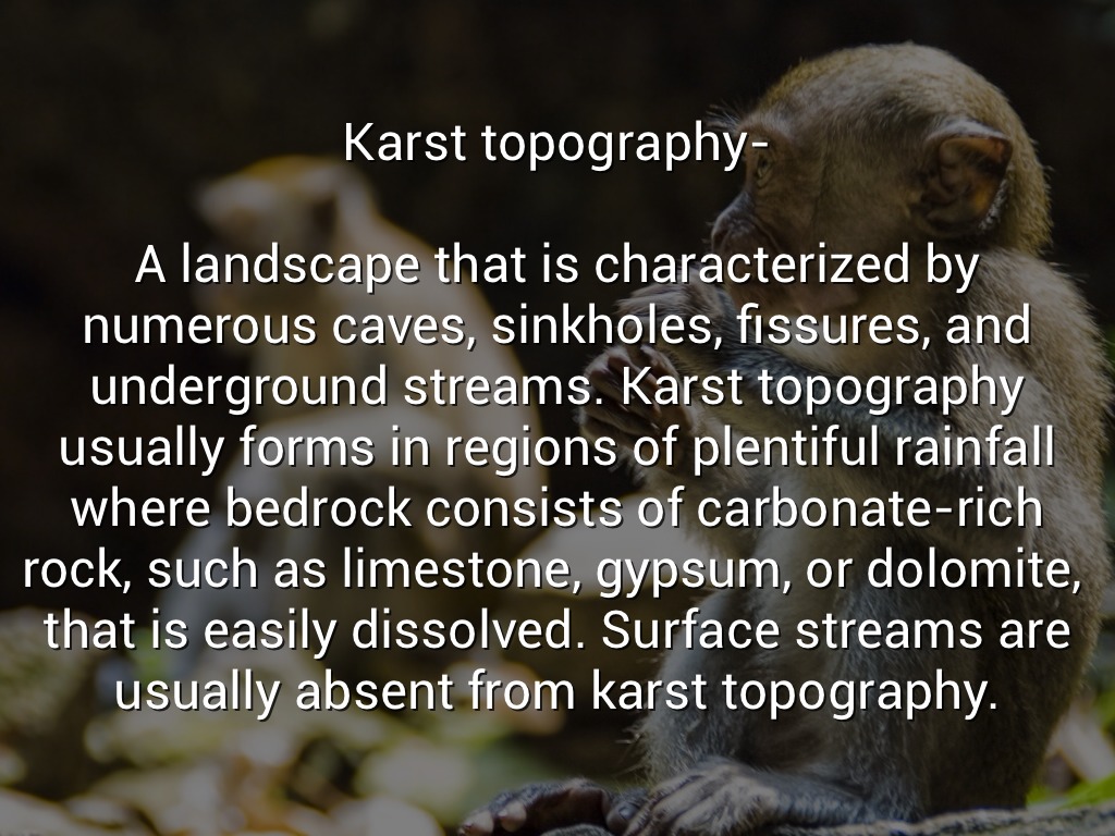 A landscape that is characterized by numerous caves, sinkholes, fissures, and underground streams. Karst topography usually forms in regions of plentiful rainfall where bedrock consists of carbonate-rich rock, such as limestone, gypsum, or dolomite, that is easily dissolved. Surface streams are usually absent from karst topography.