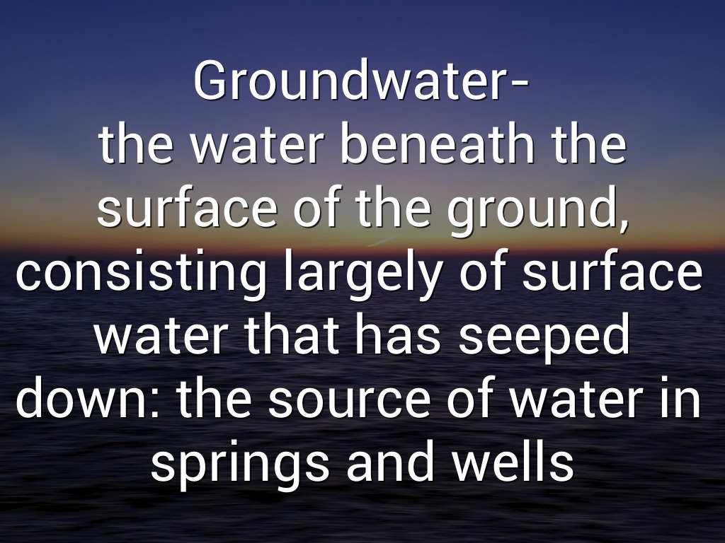 Groundwater- the water beneath the surface of the ground, consisting largely of surface water that has seeped down: the source of water in springs and wells