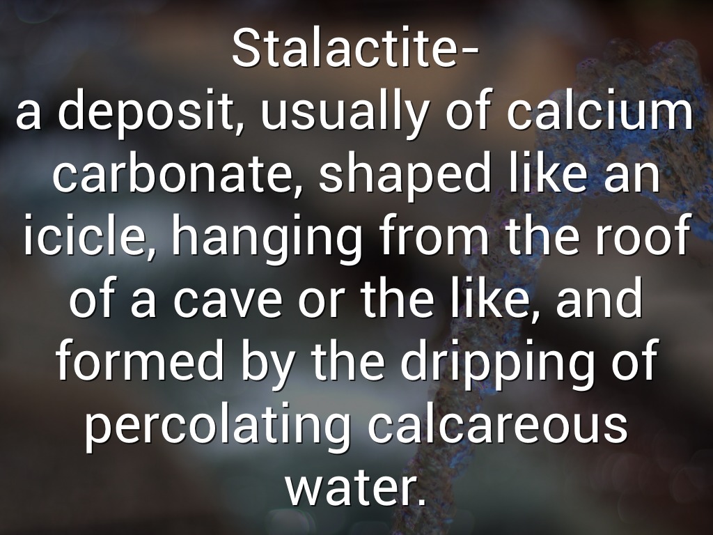 Stalactite- a deposit, usually of calcium carbonate, shaped like an icicle, hanging from the roof of a cave or the like, and formed by the dripping of percolating calcareous water.