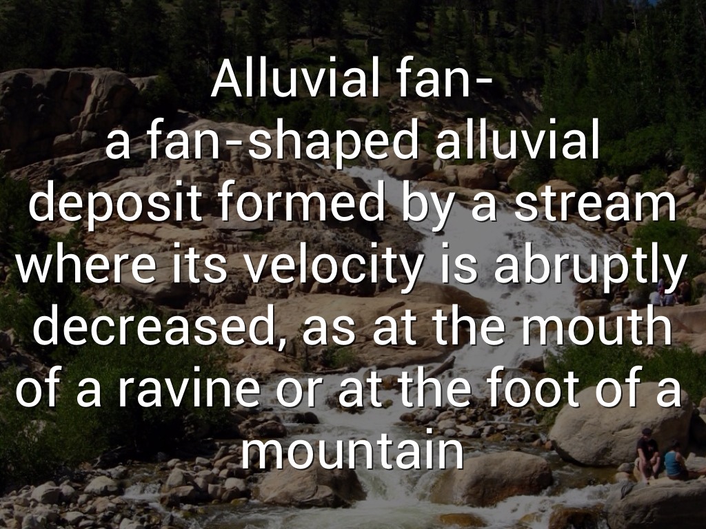 Alluvial fan- a fan-shaped alluvial deposit formed by a stream where its velocity is abruptly decreased, as at the mouth of a ravine or at the foot of a mountain