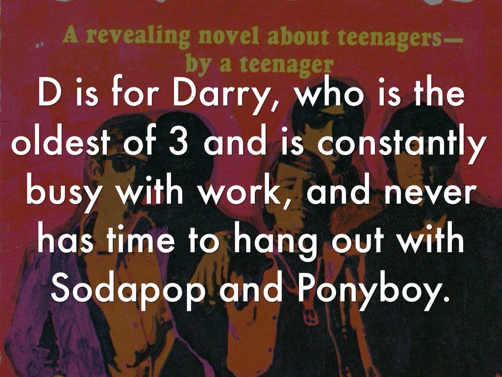 H is for the hero Dally is for when the window got broken and dally took the blame and gave them a place to hid out in and gave them money and a gun for protection.