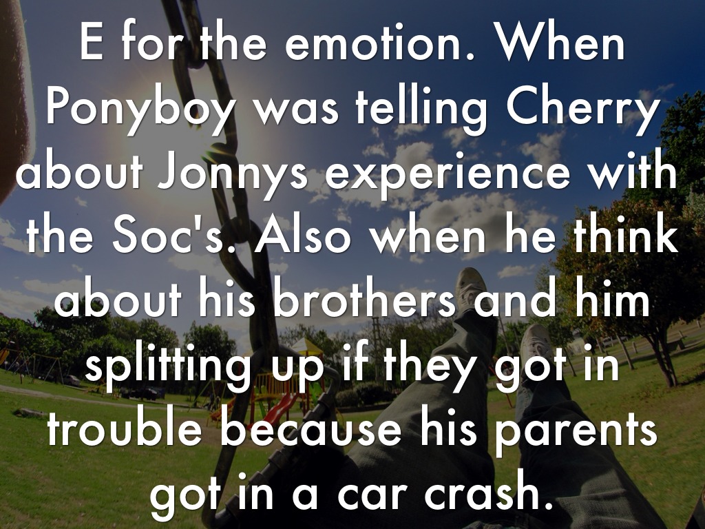 E for the emotion. When Ponyboy was telling Cherry about Jonnys experience with the Soc's. Also when he think about his brothers and him splitting up if they got in trouble because his parents got in a car crash.