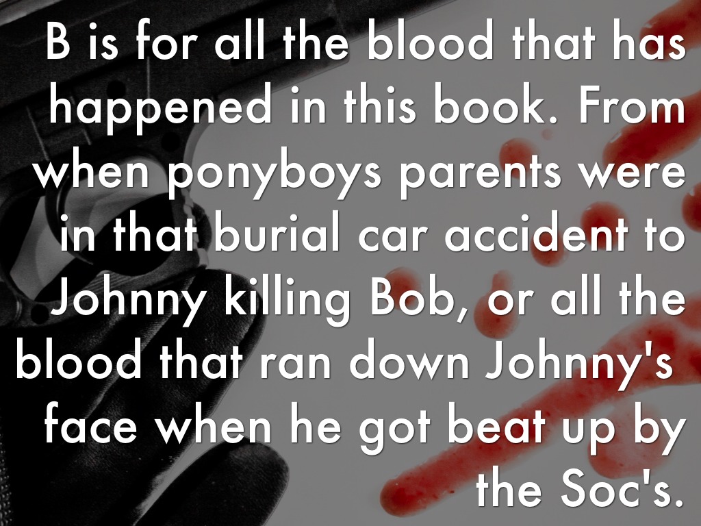 B is for all the blood that has happened in this book. From when ponyboys parents were in that burial car accident to Johnny killing Bob, or all the blood that ran down Johnny's face when he got beat up by the Soc's.